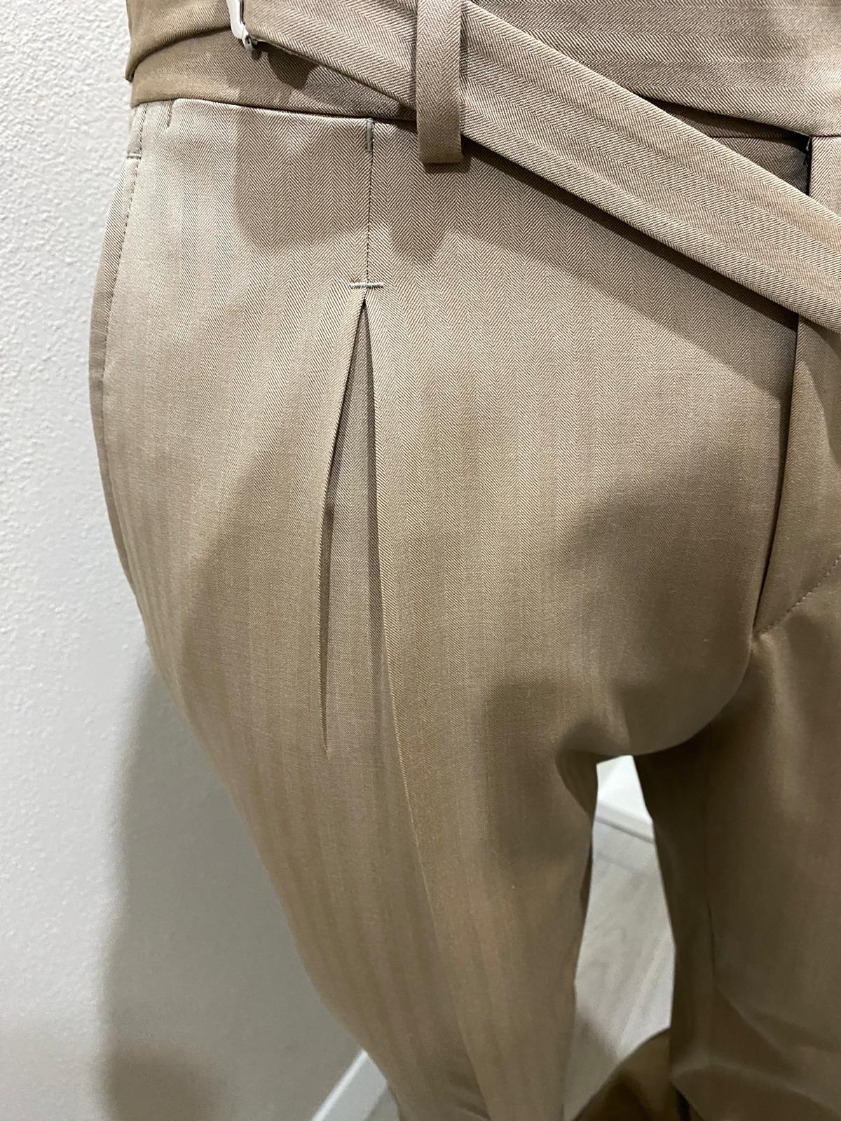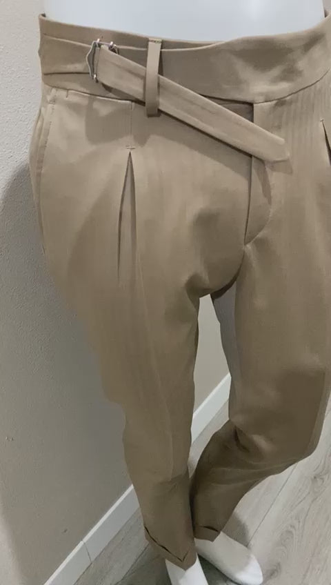 Beige single kissing pleat extended belt waistband solaro wool trousers - VBC